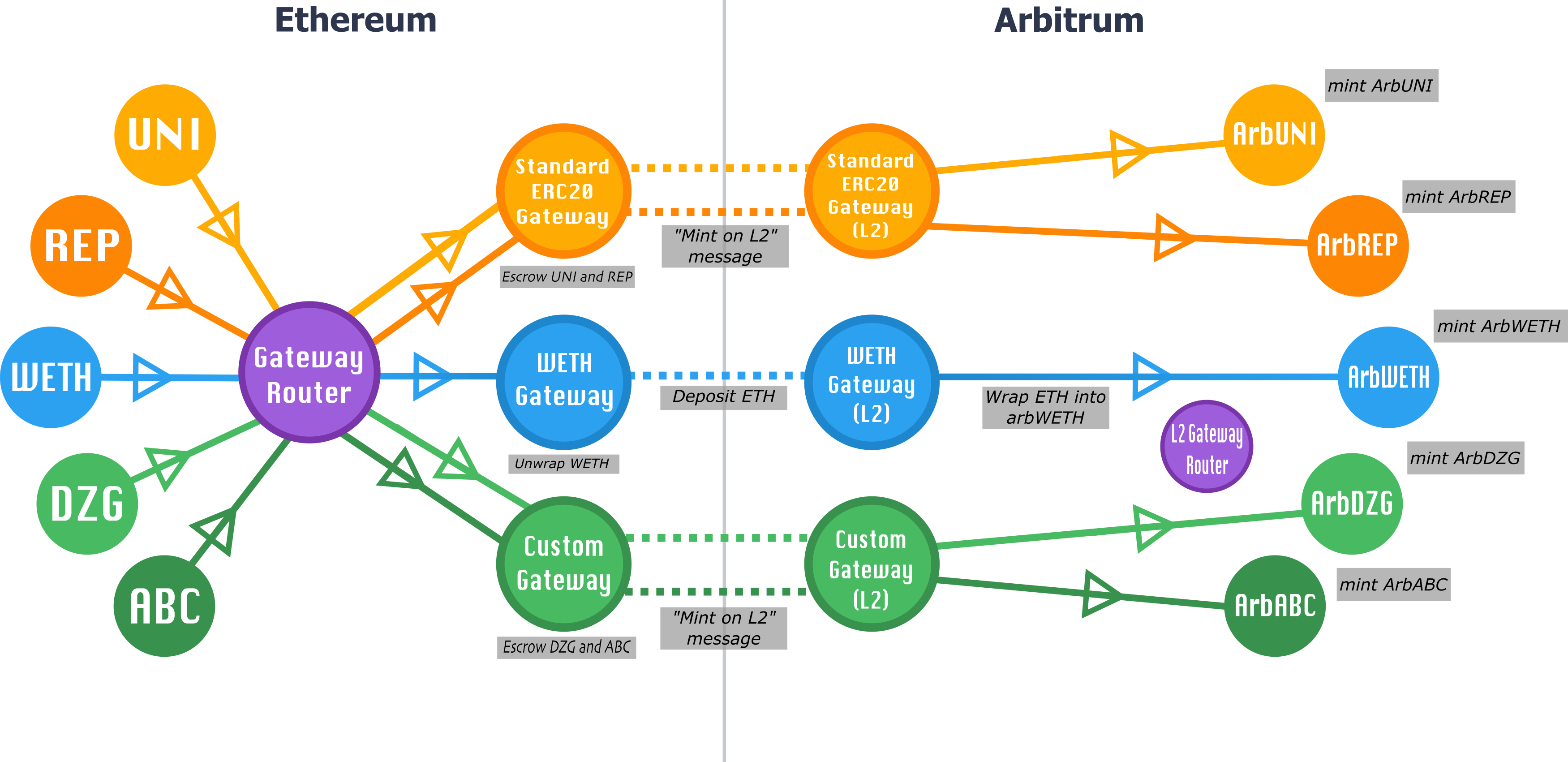 All Ethereum to Arbitrum token transfers are initiated via the router contract on the parent chain, the L1GatewayRouter contract. L1GatewayRouter forwards the token's deposit call to the appropriate gateway contract on the parent chain, the L1ArbitrumGateway contract. L1GatewayRouter is responsible for mapping the parent chain token addresses to L1Gateway contracts, thus acting as a parent/child chain address oracle and ensuring each token corresponds to only one gateway. The L1ArbitrumGateway then communicates to its counterpart gateway contract on the child chain, the L2ArbitrumGateway contract (typically/expectedly via retryable tickets).